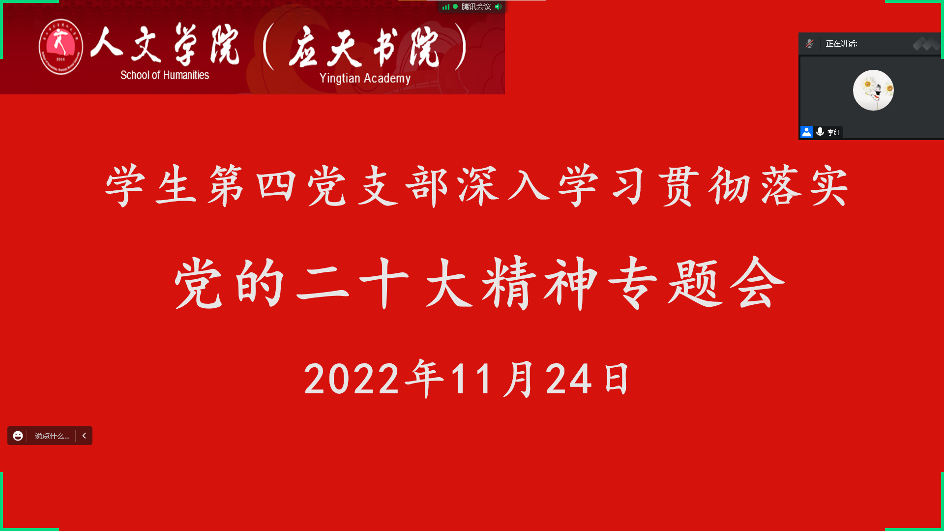 为深入学习宣传贯彻党的二十大精神,11月24日晚,Beat365官方网站学生第四党支部通过腾讯会议方式召开支部大会。会议由学生第四党支部书记李红主持,全体支部成员参会。