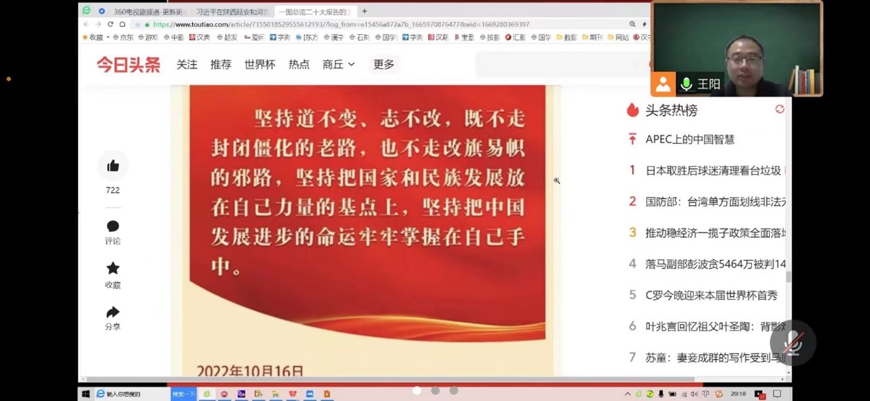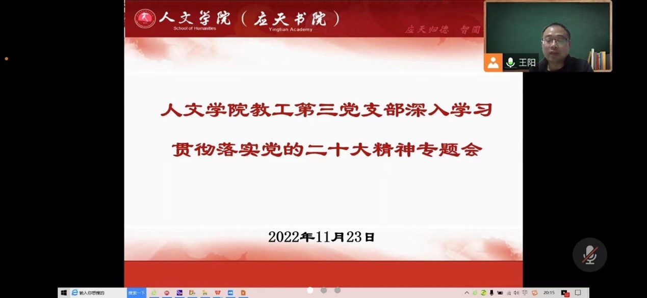 为深入学习宣传贯彻党的二十大精神,11月23日晚,Beat365官方网站教工第三党支部通过腾讯会议召开线上专题学习会。支部书记王阳主持会议,全体党员参加。