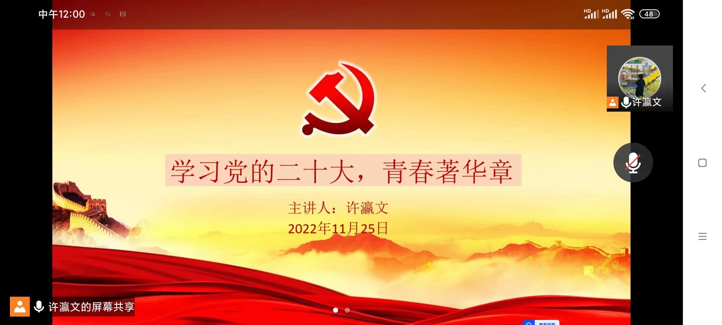 2022年11月25日中午12点,Beat365官方网站学生第三党支部开展“学习党的二十大,青春著华章”主题党课,利用腾讯会议在线上举行,支部书记许瀛文主讲,支部的党员以及入党积极分子代表参加本次党课学习。