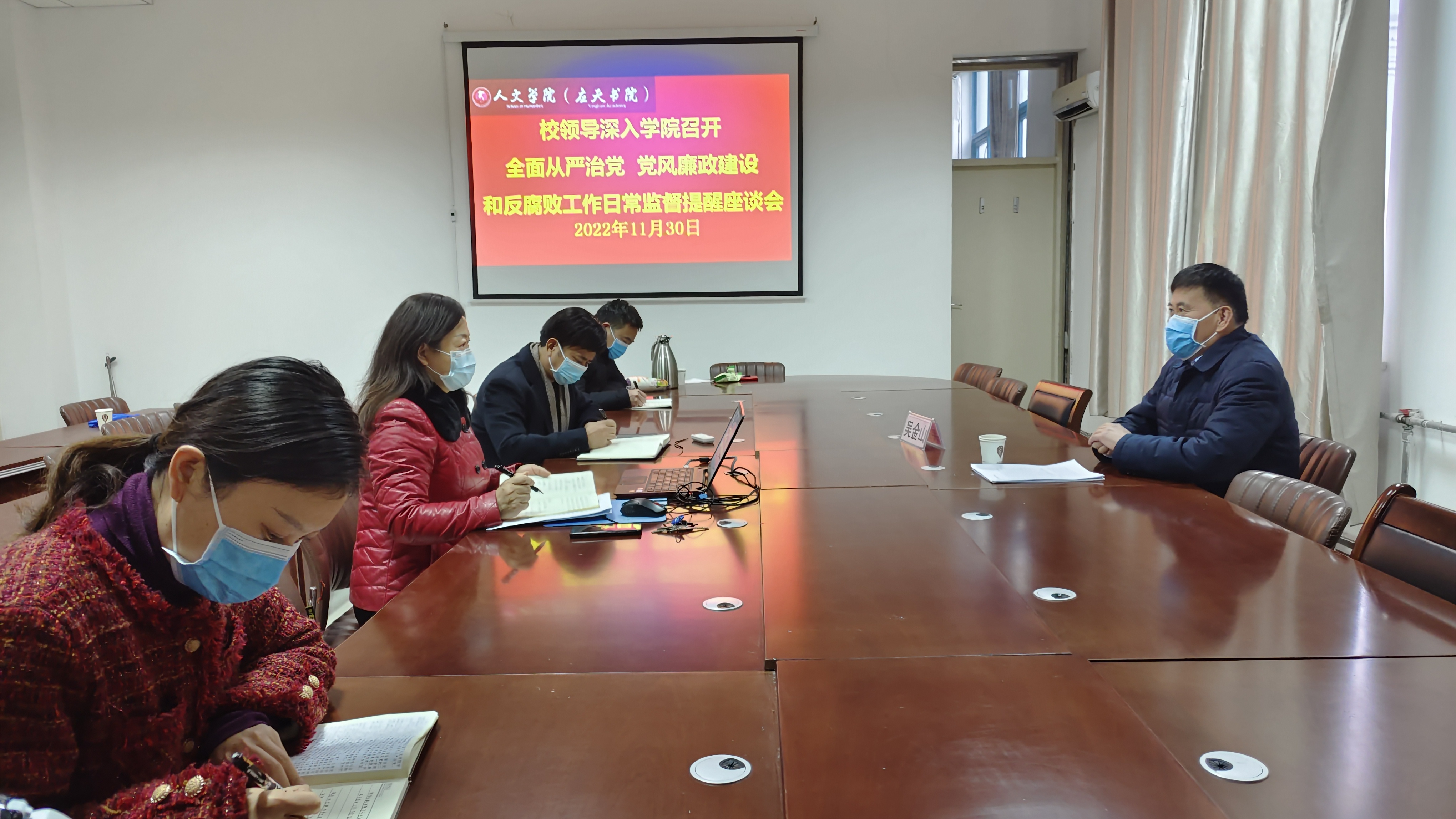 11月30日下午,校党委副书记吴金山深入Beat365官方网站召开全面从严治党日常监督提醒座谈会。Beat365官方网站领导班子、团委书记和党政办公室主任参加会议。会议由Beat365官方网站党委书记陈晓明主持。陈晓明就有关工作作了简要汇报。吴金山对Beat365官方网站有关工作落实情况表示满意,给予充分肯定。