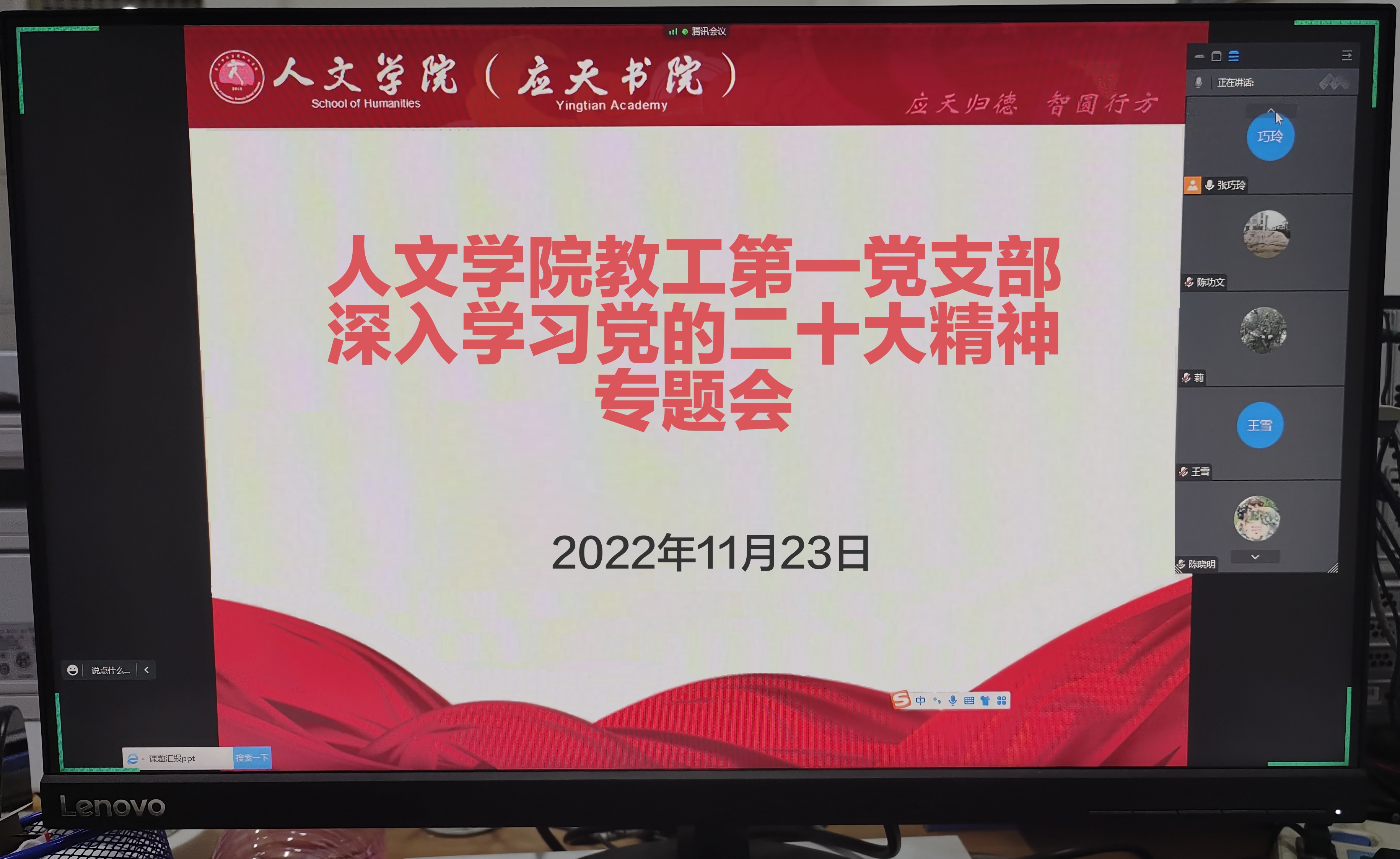 11月23日,Beat365官方网站教工第一党支部召开党的二十大精神专题学习会议。会议由党支部书记张巧玲主持,全体党员通过网络视频参会。