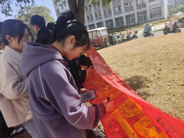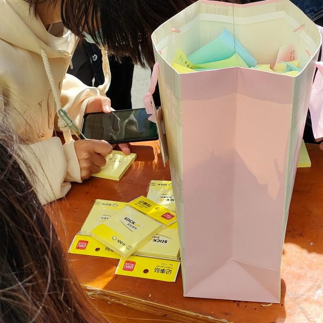 在活动过程中,工作人员为同学们提供马克笔和便利贴,引导同学们有序进行签名和书写,耐心的为同学们扫码签到。最后,在同学们的积极参与和工作人员的共同努力下,本次活动圆满结束。