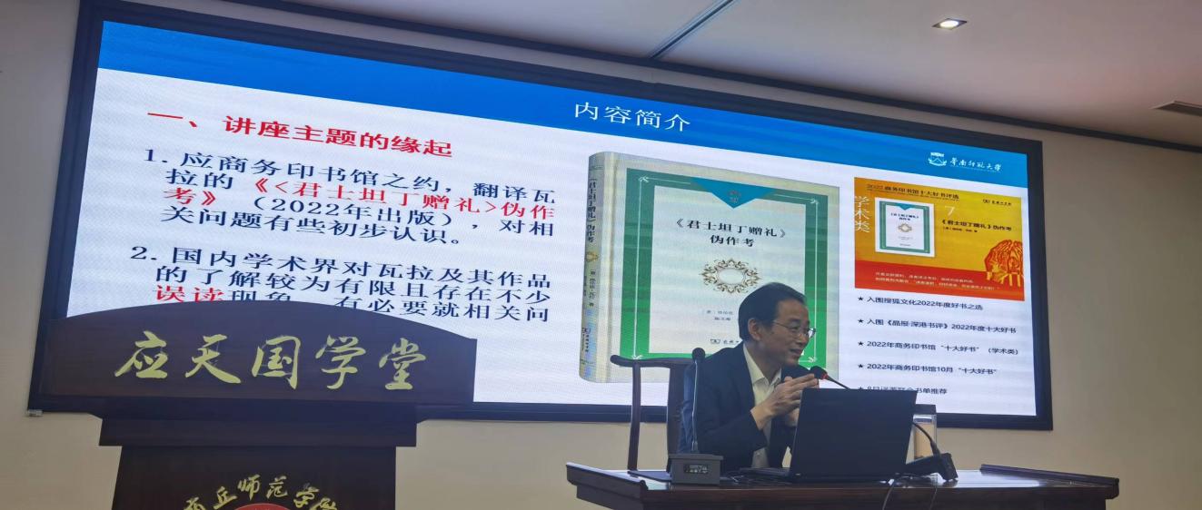 在讲座中,陈文海教授首先介绍了讲座主题的缘起并对瓦拉、《君士坦丁赠礼》《<君士坦丁赠礼>伪作考》以及文艺复兴时代做了简略介绍。随后陈文海教授围绕“大公会议至上论”环境下的瓦拉及其人生历程、《君士坦丁赠礼》的历史面貌及相关争议、《<君士坦丁赠礼>伪作考》的基本面貌等主题展开了论述。陈文海教授以时间为线索结合瓦拉各时期的著作与论述介绍了瓦拉的人生历程,并提出需结合某人全部著作来全面了解其思想。在陈文海教授介绍了《君士坦丁赠礼》的基本历史面貌以及在瓦拉之前对其产生质疑的诸多学者的观点,同时也提到了近现代史学家对此书的研究结论。陈教授还分析了《<君士坦丁赠礼>伪作考》的基本特征是修辞学色彩浓厚,基本动机是为现实政治服务以及文章的内容与论证方法,尤其指出瓦拉所使用的内证法是其区别其他学者外证法的独特方法,是使其文章具备独特性与重要性的重要原因。