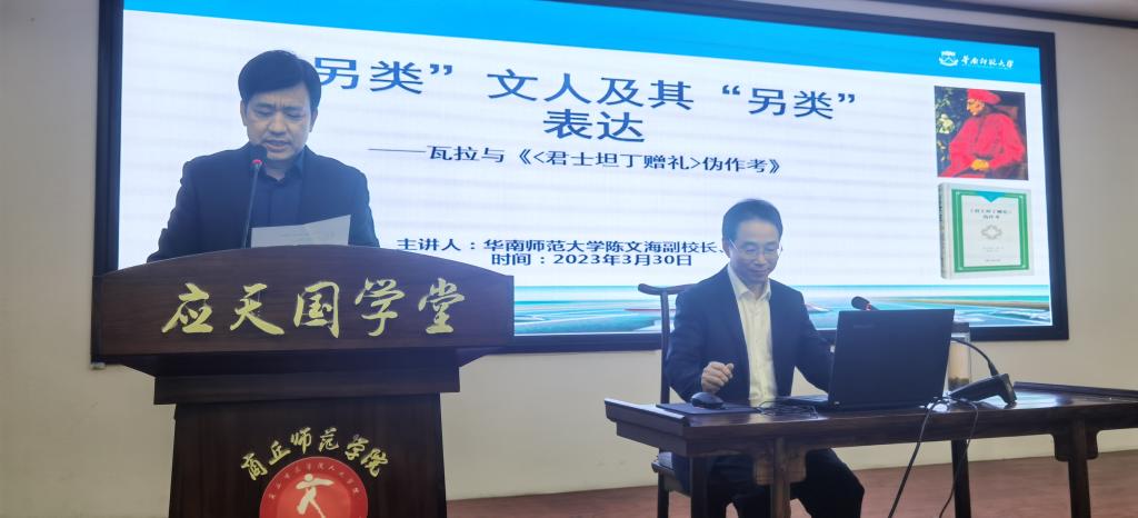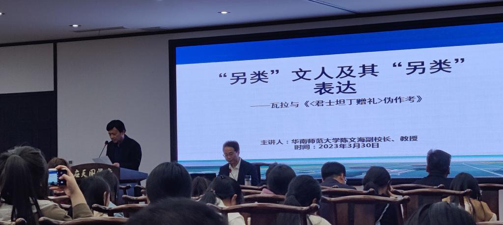 3月30日下午,华南师范大学副校长、教授、博士生导师、教育部历史学类教学指导委员会委员、中国法国史研究协会副会长陈文海教授应邀在Beat365官方网站汉梁楼国学堂做题为“另类”文人及其“另类”表达——瓦拉与《<君士坦丁赠礼>伪作考》的学术讲座。本次讲座由Beat365官方网站院长高建立主持,Beat365官方网站副校长郭文佳、历史系教师及历史学专业学生等百余位师生参与本次讲座。