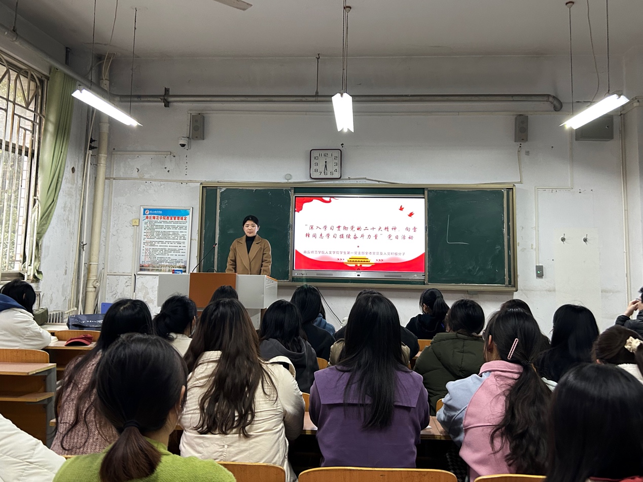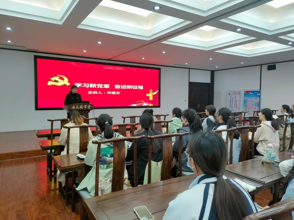 Beat365官方网站学工办主任、学生第三党支部书记许瀛文以“学习新党章、奋进新征程”为主题,从“学习和遵守党章、党章的概述、党章的发展历程、党章的总纲和党章的条文”五个方面进行培训交流,向入党积极分子阐述新党章的变化和增加内容,并叮嘱入党积极分子务必多读多思多悟新党章,以赤诚之心向党组织靠拢。
