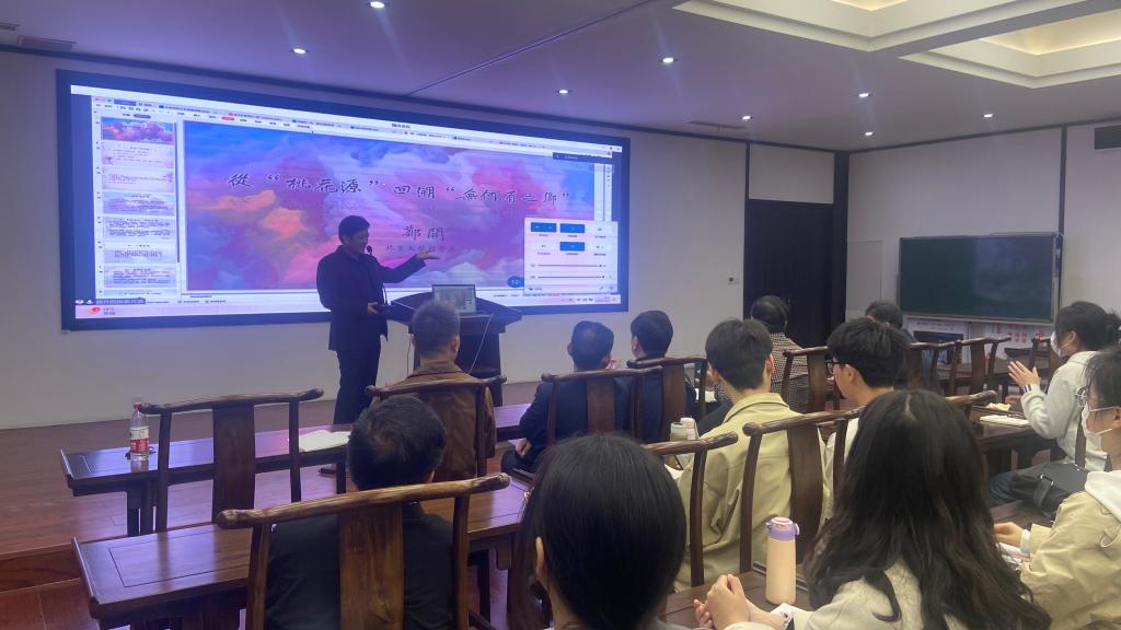 郑教授以“从桃花源回溯无何有之乡”为题,按照“寻找桃花源——无何有之乡——至德之世、建德之国——小国寡民——精神的高处——从无何有之乡到人间世”的逻辑线索,对庄子著作中超越性精神性空间的内涵、特点等进行了深入揭示和诠释。通过由陶渊明的“桃花源”回溯到庄子的“无何有之乡”,向我们全景展示了道家及接受了道家思想的中国知识分子对精神、心灵自由的无限向往和美学表达。无论是庄子的无何有之乡,还是陶渊明的“桃花源”,都是中国古代士人知识分子追求精神自由和丰富内心世界的外溢性期待表征,也是中国古代士人知识分子儒道兼综人格的充分彰显以及身处逆境时的避世心理的外透。同时,郑教授的演讲,也从另一个角度深刻揭示了中国隐逸文化背后的深层思想渊源。