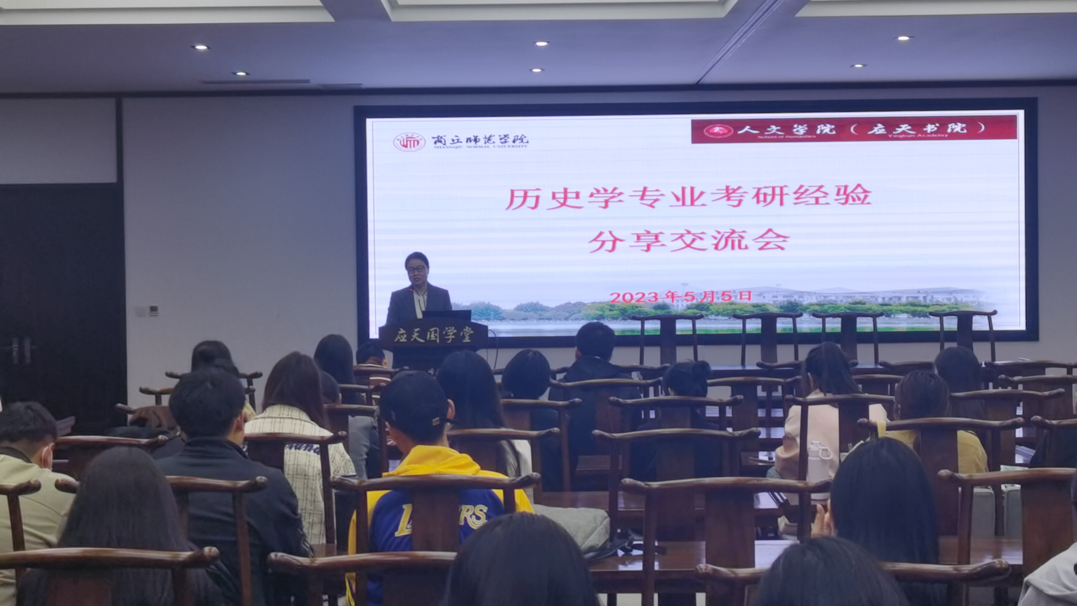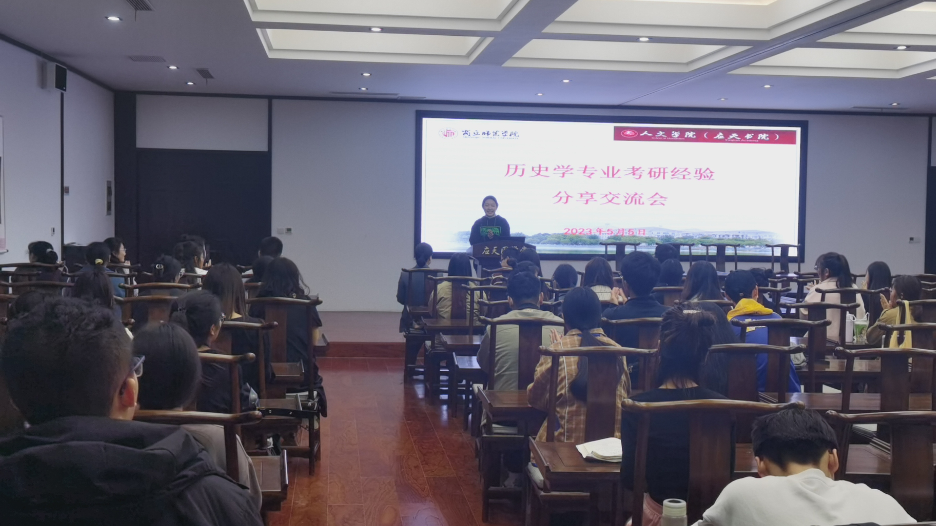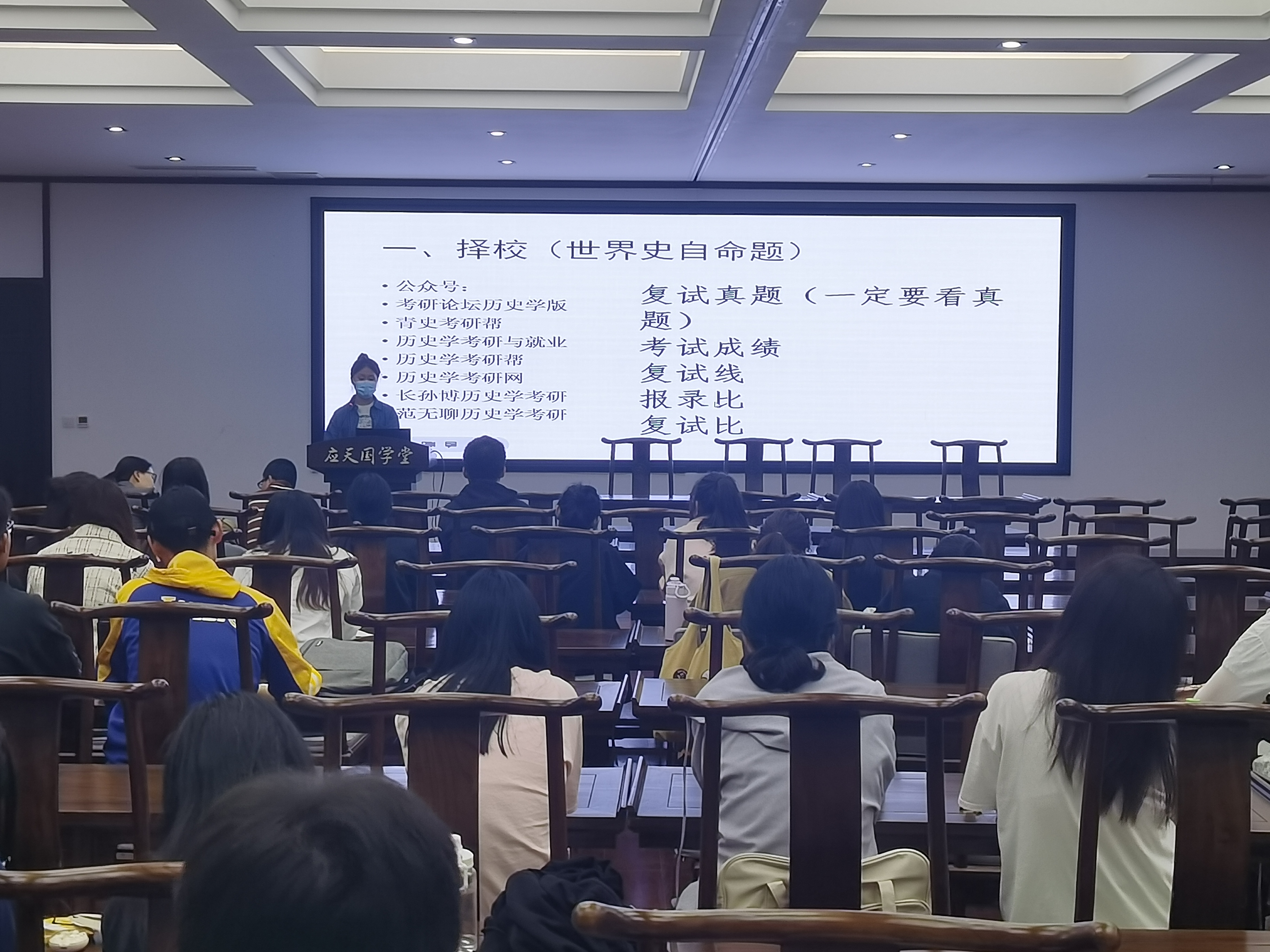 会议伊始,历史系主任薛立芳老师做动员发言,介绍了本次活动的背景及流程,公布了学院2019级学生的考研结果,并对他们取得的优异成绩表示祝贺,鼓励在座各位同学敢想敢做,再创佳绩。随后,成功上岸的尚嘉宁、王悦、王丙宜、刘雪洁、张淼、李金月等学姐们以PPT的形式,结合自身考研经历,围绕专业和院校选择、复习计划制定、各学科备考方向、心态调整等方面分享了各自的体验和感受,对备考过程中遇到的难题以及解决方式向学弟学妹们提出了宝贵的建议。于志刚老师和杨金华老师也提出了自己的建议,让意向考研的同学们对考研有了更深刻、更全面的了解。