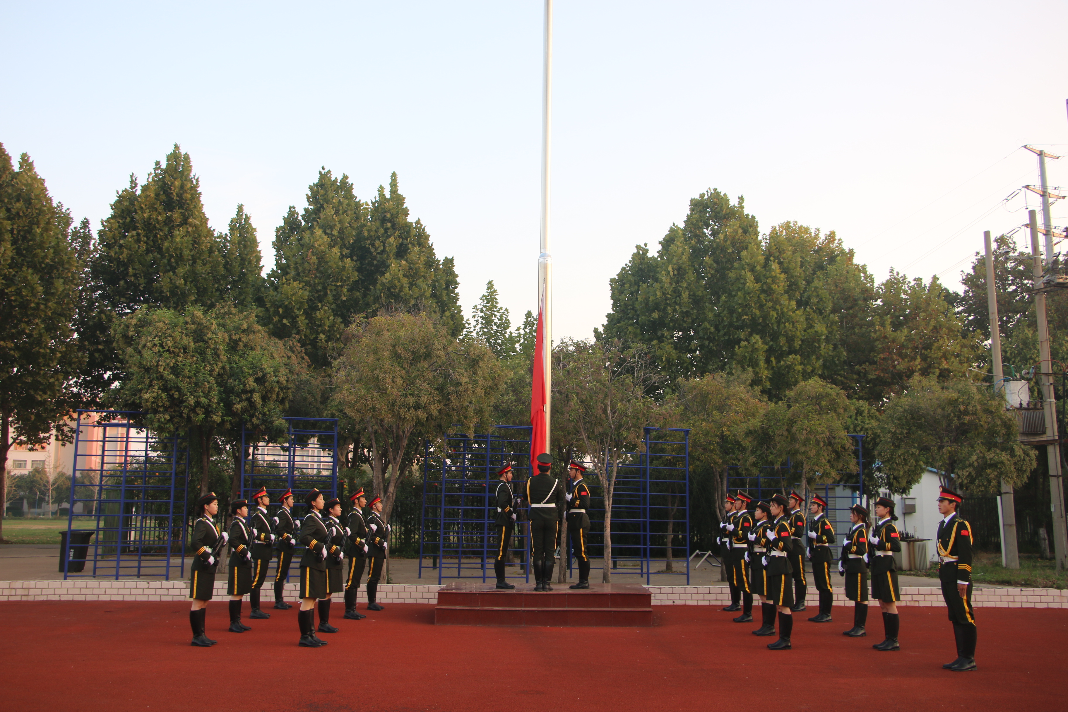6时50分,升旗仪式正式开始,伴随着庄严的《义勇军进行曲》,迎着清晨第一缕朝阳,五星红旗冉冉升起,在场师生怀着对祖国无限的热爱和崇高的敬意,面向国旗行注目礼。
