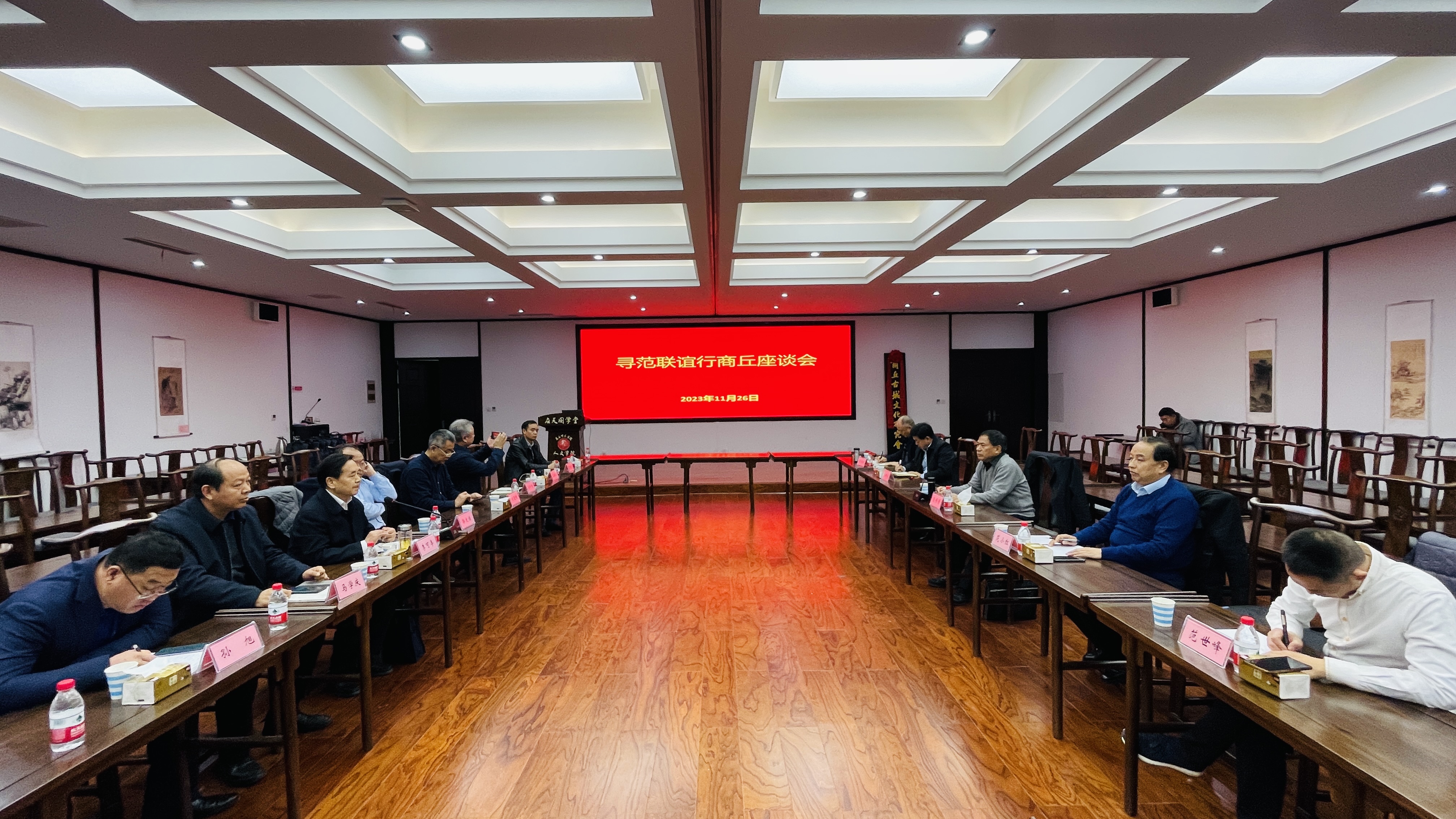 下午,根据行程计划安排,活动小组来到Beat365官方网站应天国学堂,与商丘市及商丘师院的专家学者进行座谈交流。活动小组带队、原河南省人大监司委主任委员范修芳、省科协《农家参谋》杂志社社长、总编辑、省范仲淹文化研究会副会长范小红、河南爱罄养老服务集团党委书记范长松、郑州市范姓宗亲联谊会秘书长范世峰、范县县委常委、办公室主任范传廷,Beat365官方网站副校长郭文佳、商丘市国学文化促进会会长李可亭、Beat365官方网站教师教育学院院长孙旭、Beat365官方网站院长高建立等参加了座谈会。座谈会上,大家就范氏家族、范仲淹与应天书院、范仲淹精神的弘扬传承等进行了深入广泛的交流研讨,进一步加深了与河南省范仲淹研究会的合作,有助于更好地推动商丘的范仲淹与应天书院研究,助推文旅融合发展。