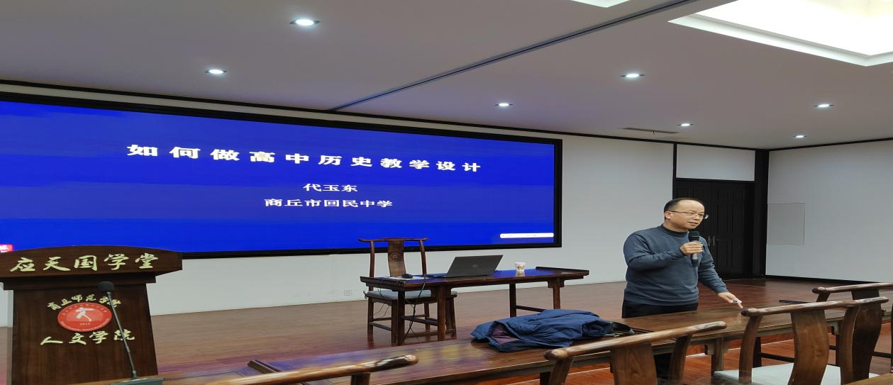 活动伊始,魏清彩老师首先对代玉东老师抽出宝贵时间为同学们做讲座表示了感谢和热烈欢迎。随后,代玉东老师开展了题为《如何做高中历史教学设计》的专题讲座,从教学设计的主要内容以及历史教学主要环节等几个部分进行深入讲解。