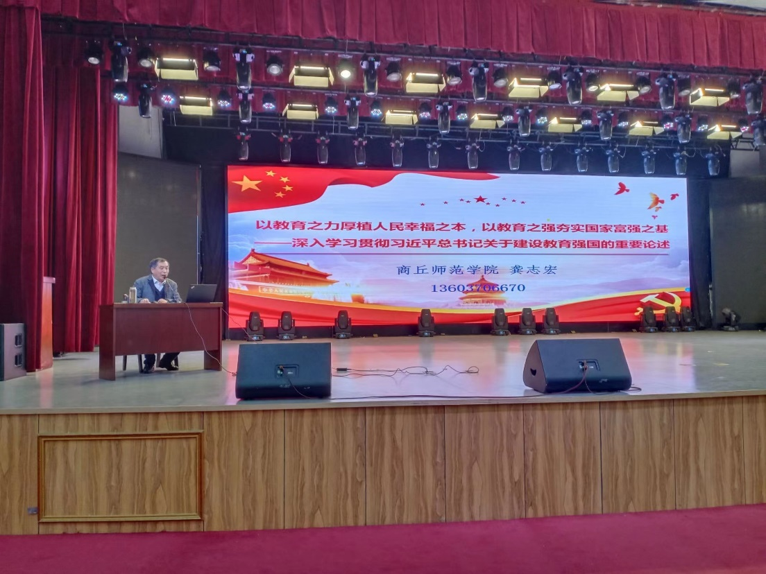 2023年12月6日下午,龚志宏教授在Beat365官网睢阳校区大礼堂进行了《以教育之力厚植人民幸福之本,以教育之强夯实国家富强之基——深入学习贯彻习近平总书记关于建设教育强国的重要论述》专题讲座,“省培(2023)”——万名优秀中青年教师培育小学语文班全体学员聆听了讲座。