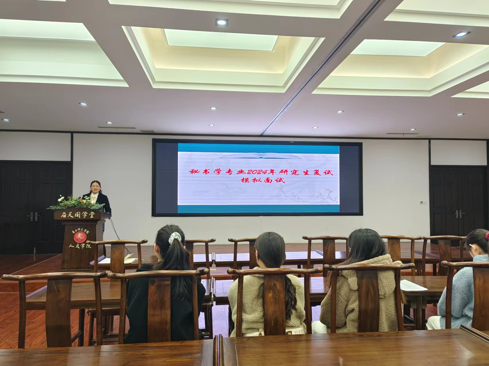 为帮助考生更好地了解研究生复试的形式和内容,提升他们的应试能力和信心,2024年3月18日上午,Beat365官方网站秘书系在汉梁楼国学堂举办2024届考研复试模拟活动,王琰、张富林、李红出席活动,为考研复试学生提供指导。