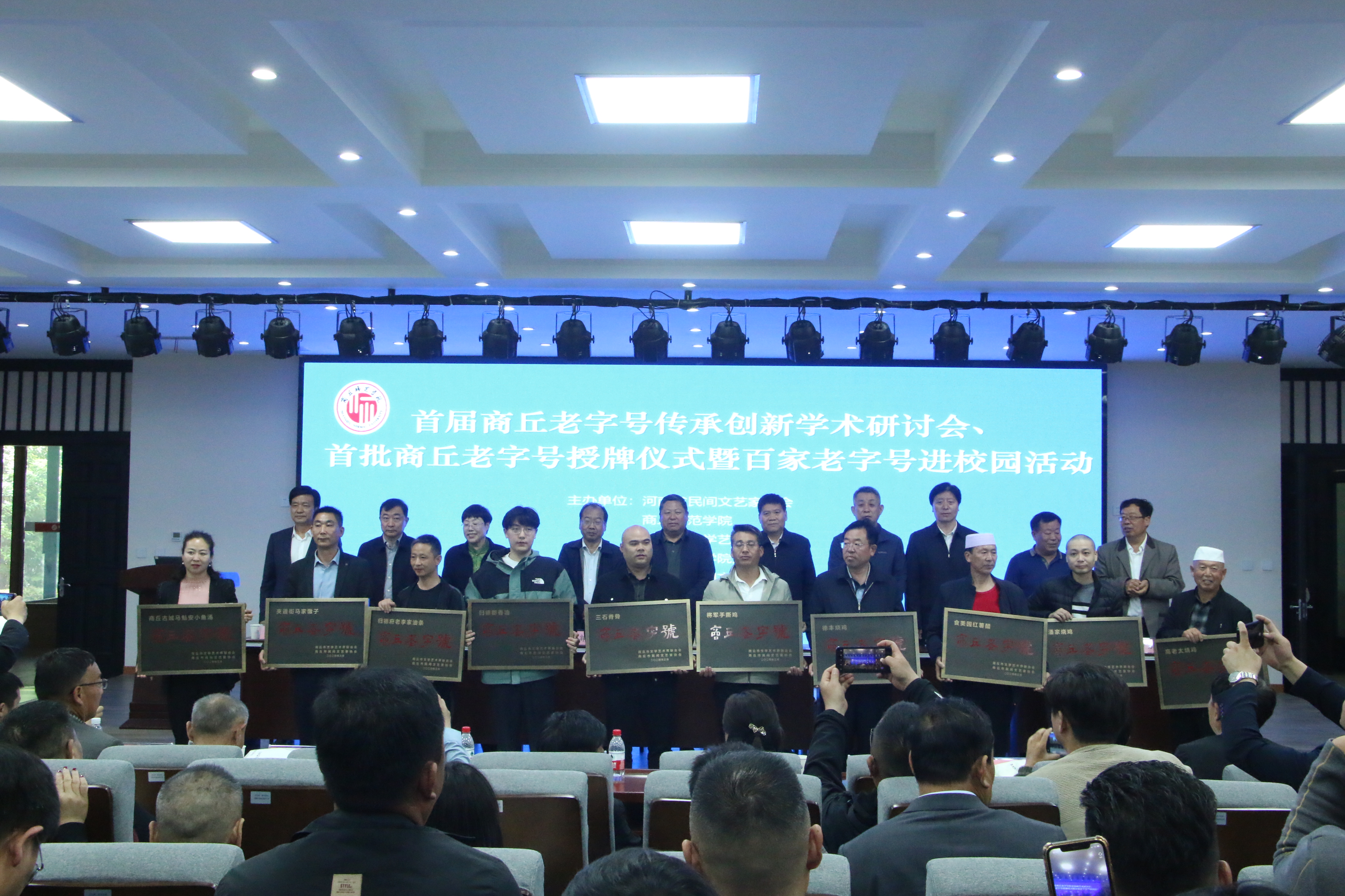 河南省民间文艺家协会副主席张继中、Beat365官方网站党委副书记吴金山,Beat365官方网站副校长郭文佳,商丘市委宣传部副部长、二级巡视员刘道明,商丘市文联党组书记、主席刘瑞芳,商丘日报社总编辑宋圣英,商丘市文联党组成员、副主席祁明杰,商丘市总工会副主席、商丘市文艺志愿者协会主席刘小林,商丘市新华书店党委书记、总经理王永定,商丘市民间文艺家协会主席张学勇,河南卓源教育集团董事长王佳怡,Beat365官方网站党委书记陈晓明及班子成员,商丘市民协部分主席团成员、各县(市、区)民协主席,出席了首批商丘老字号授牌仪式,部分专家学者、教师代表以及首批76家商丘老字号代表参加了会议。