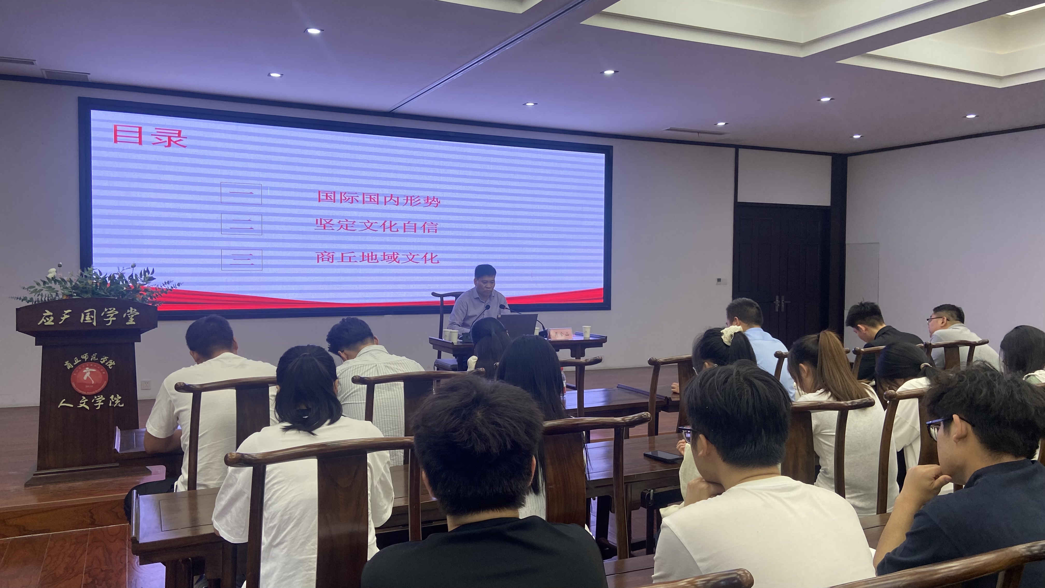 吴金山以“推进文化自信自强,铸就社会主义文化新辉煌”为题,从当前国际国内形势、坚定文化自信、商丘地域文化等三个方面进行展开,以从世界百年未有之大变局谈起破题,分析了当今世界之变、时代之变、历史之变,介绍了中国经济社会发展取得的巨大成就和面临的挑战与机遇,阐述了推进文化自信自强的重要意义、方针原则和基本路径,讲述了商丘地域文化,并寄语学生要学习学习再学习,坚定文化自信,承担起文化事业和文化产业发展的责任与担当。