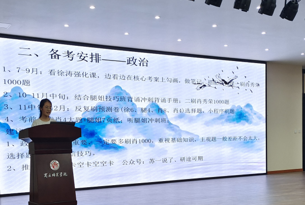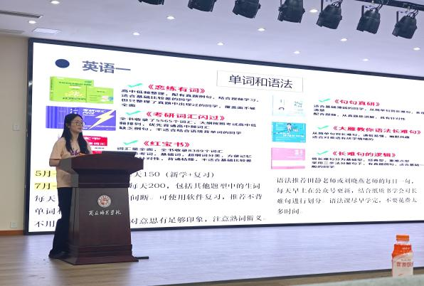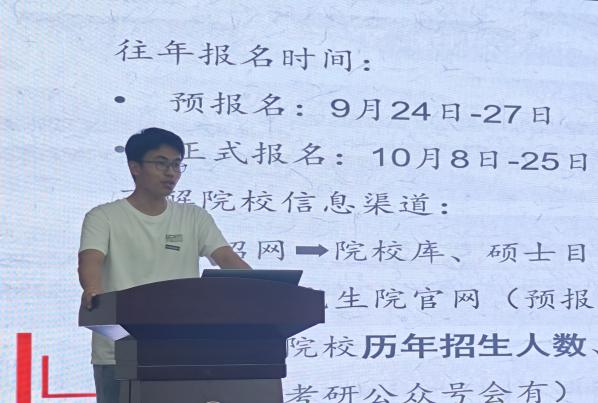 随后,沈湘楠等七位学长学姐先后做分享报告,他们结合自身的考研经历,详细讲解在考研过程中如何根据个人情况选择合适的院校、如何高效利用资料、如何调整心态保持积极状态等方面的经验和心得。他们不仅分享了英语、政治和历史学专业课的学习方法,还推荐了一系列考研相关的书籍、公众号和网站。同时,他们还着重强调了备考过程中调整心态的重要性,为即将参加考研的2025届学子提供了明确的方向和指导。