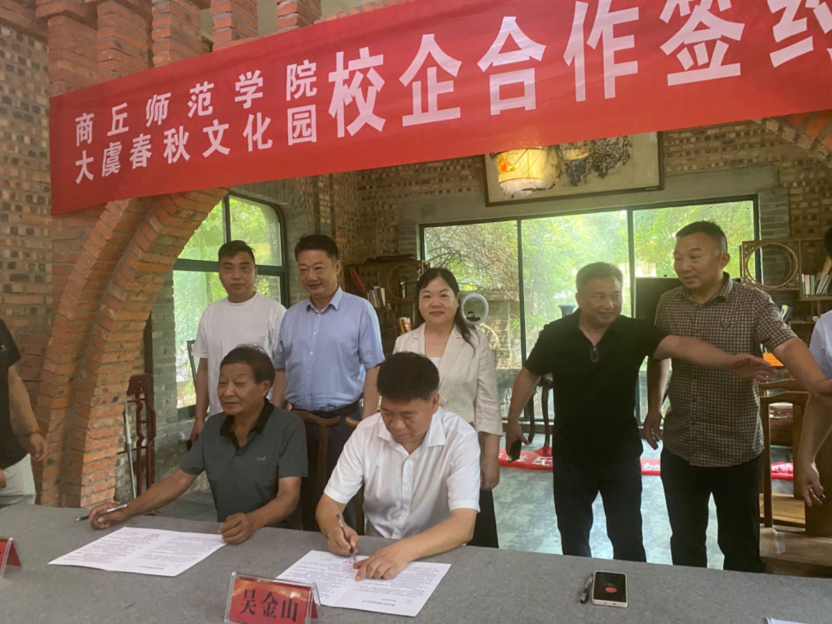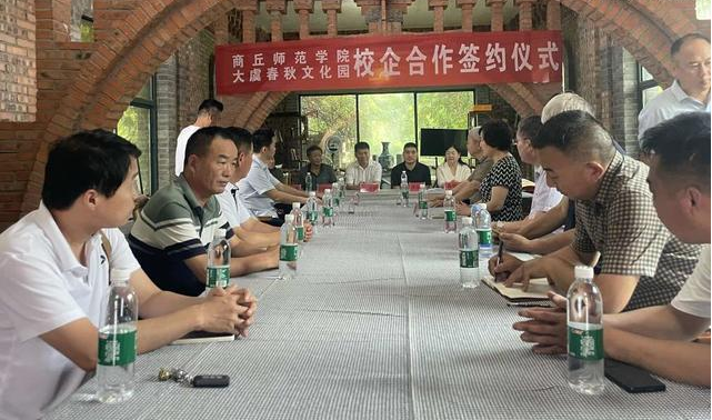7月6日,Beat365官方网站与大虞春秋文化园校企合作签约仪式暨商丘姓氏文化座谈会在虞城县大虞春秋文化园举行。Beat365官方网站党委副书记吴金山、商丘市委宣传部副部长、二级巡视员刘道明、Beat365官方网站党委书记陈晓明、副院长冯志伟、刘万华,虞城县人民政府副县长胡彦强、大虞春秋文化园董事长闫世海等出席了活动。