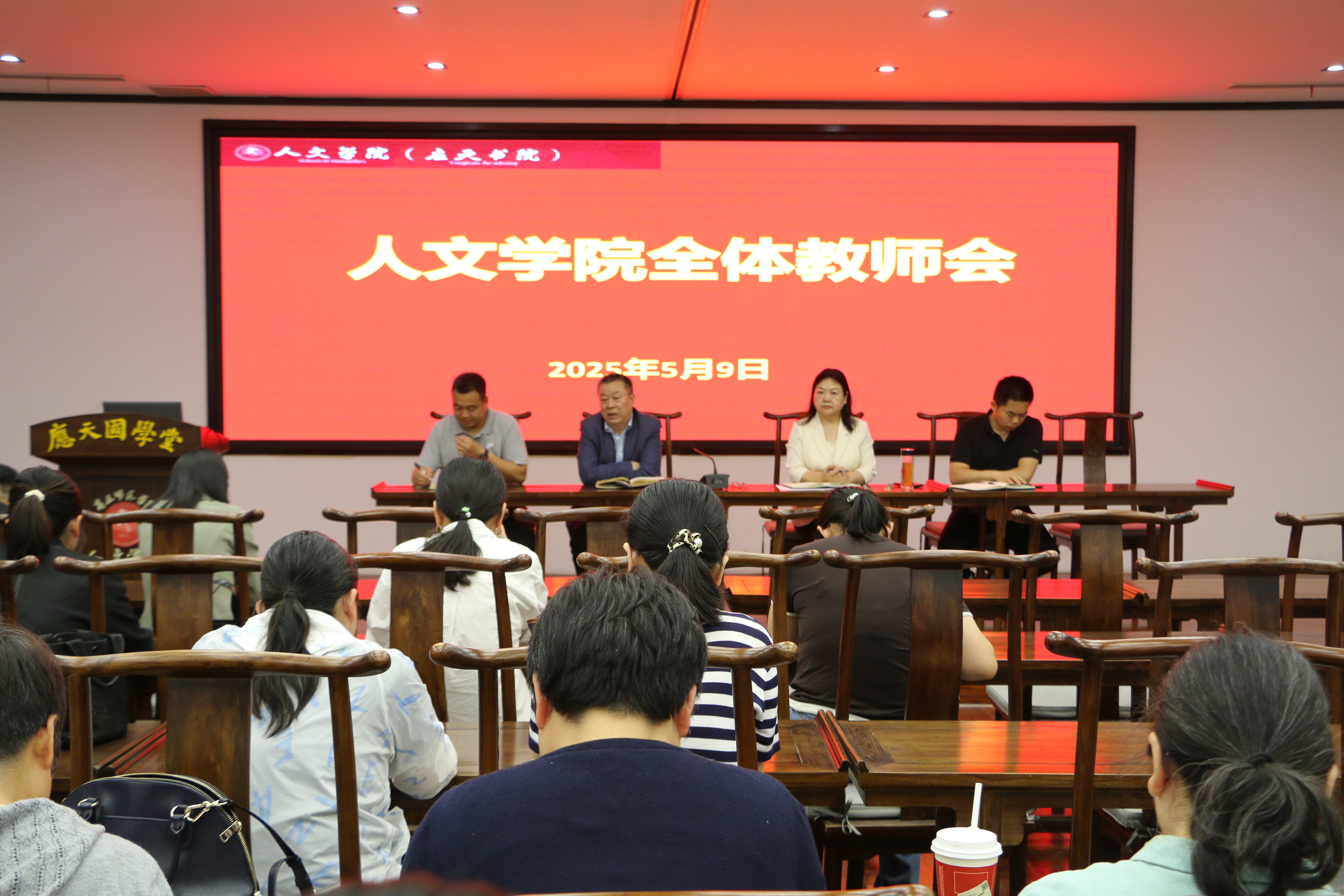 5月9日下午,Beat365官方网站在汉梁楼国学堂召开全体教师会议,围绕毕业生就业、教学科研、学生管理等近期重点工作进行部署。学院党委书记陈晓明主持会议,党委副书记卢忠雷、副院长冯志伟、刘万华及全体教师参加会议。
