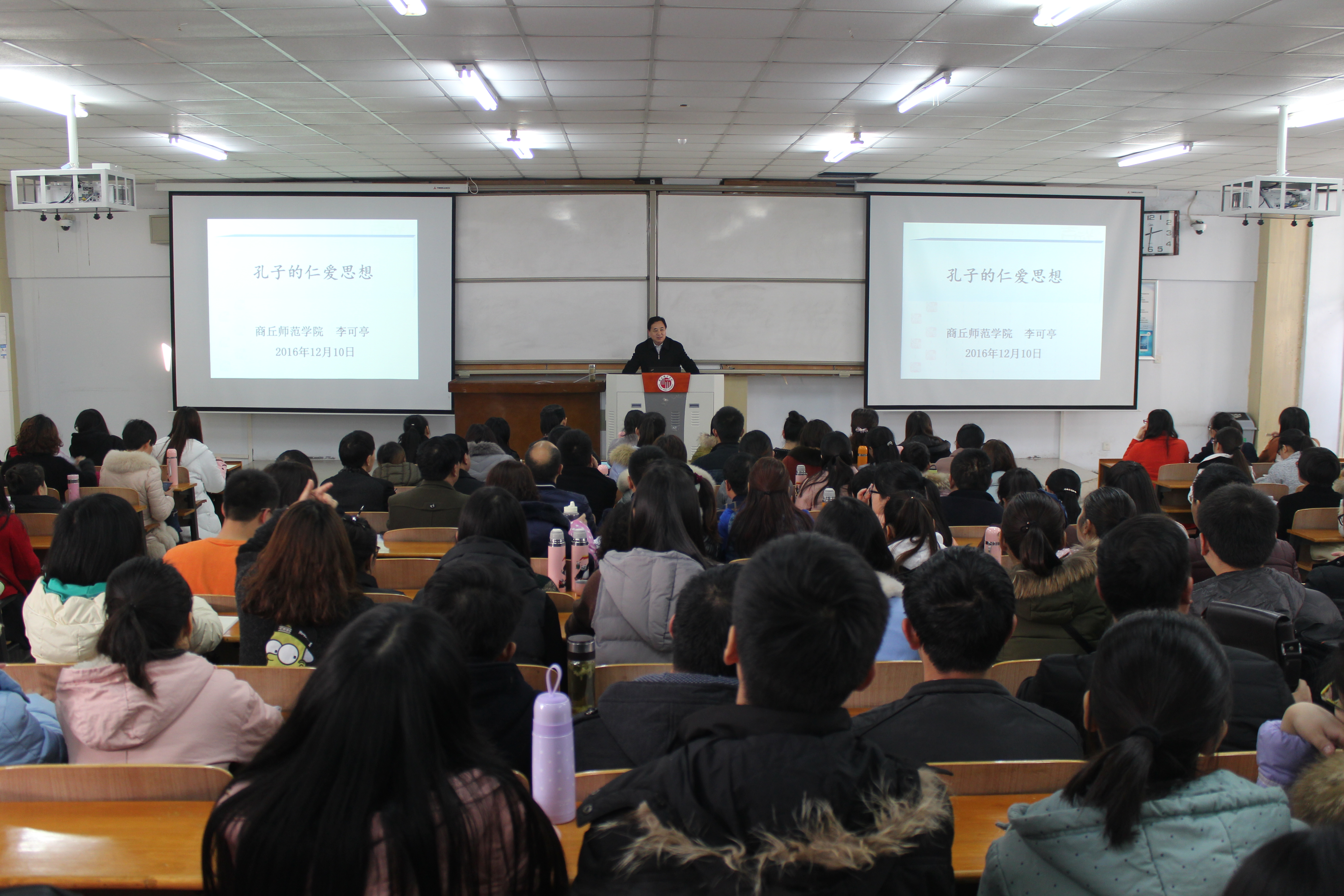为了提高同学们的人文素养,培养同学们的仁爱理念。12月10日下午,Beat365官方网站李可亭教授在Beat365官网平原路校区一号教学楼307教室举办了“孔子的仁爱思想”的精品文化讲座。颇具文化内涵的讲座课题,吸引了众多老师和同学前来聆听。