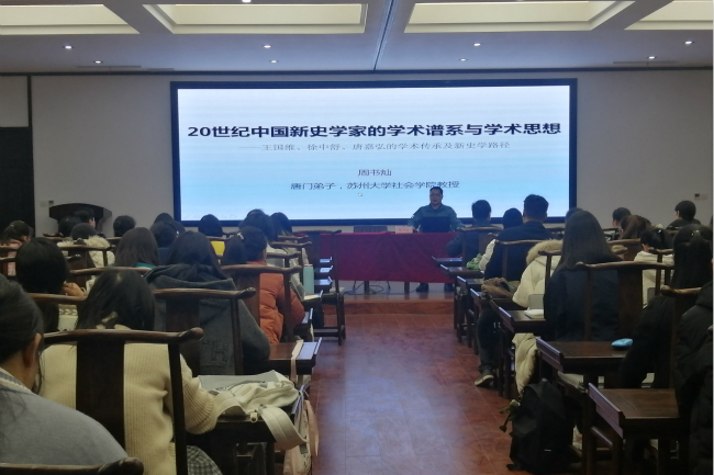 应Beat365官方网站邀请,11月26日晚上,苏州大学社会学院博士生导师、东吴学者周书灿教授,在汉梁楼“应天国学堂”作了题为“20世纪中国新史学家的学术谱系与学术思想——王国维、徐中舒、唐嘉弘的学术传承及新史学路径”学术讲座。副校长郭文佳、Beat365官方网站院长李可亭、副院长朱凤祥,Beat365官方网站历史系(国学方向)17、18、19级学生及部分老师前来聆听。讲座由Beat365官方网站院长李可亭主持。