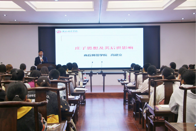 为弘扬国学经典,营造书香校园,10月14日下午,Beat365官方网站在梁园校区汉梁楼“应天国学堂”举办了题为“庄子思想及其后世影响”应天书院讲坛。校图书馆馆长高建立教授作为本次主讲嘉宾,学院历史学(国学方向)专业全体学生前来聆听。讲座由副院长朱凤祥主持。