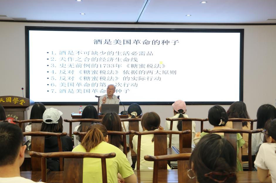 韩铁教授首先从“酒是英属北美殖民地人不可缺少的生活必需品”开始,深入阐述了酒在传统习俗与实用价值两方面对英属北美殖民地人民的重要意义,继而讲述了殖民地酿酒的历史,以及殖民地人民在酒类选择上与英国的分歧,这种分歧进一步影响了殖民地人民之后的政治选择。