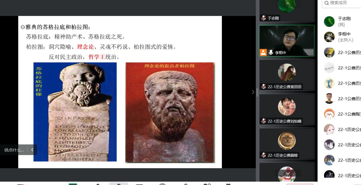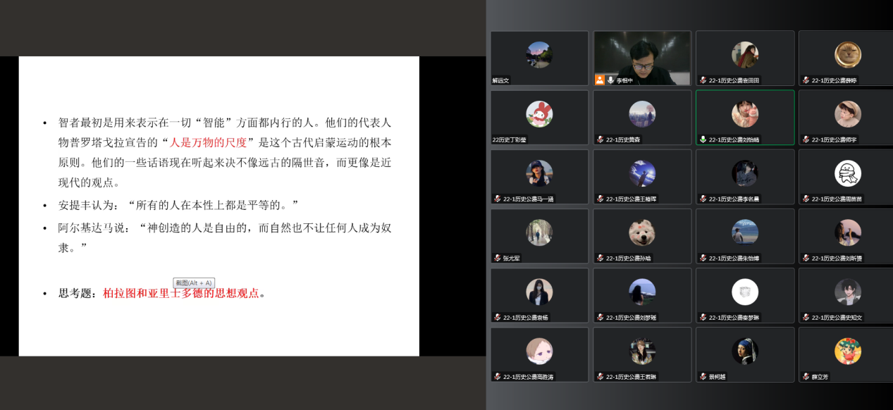 2022年11月23日(周三)下午第一节,历史系李相中老师的《世界古代史》课程教学范式改革公开课通过腾讯会议线上举行。历史系薛立芳、于志刚、张尤军、魏清彩、白茹冰、龙坡涛、杨金华、杨恒显、解远文、舒笛、周福等老师参加了线上教学观摩活动,并在课后和李老师进行了评课议课。