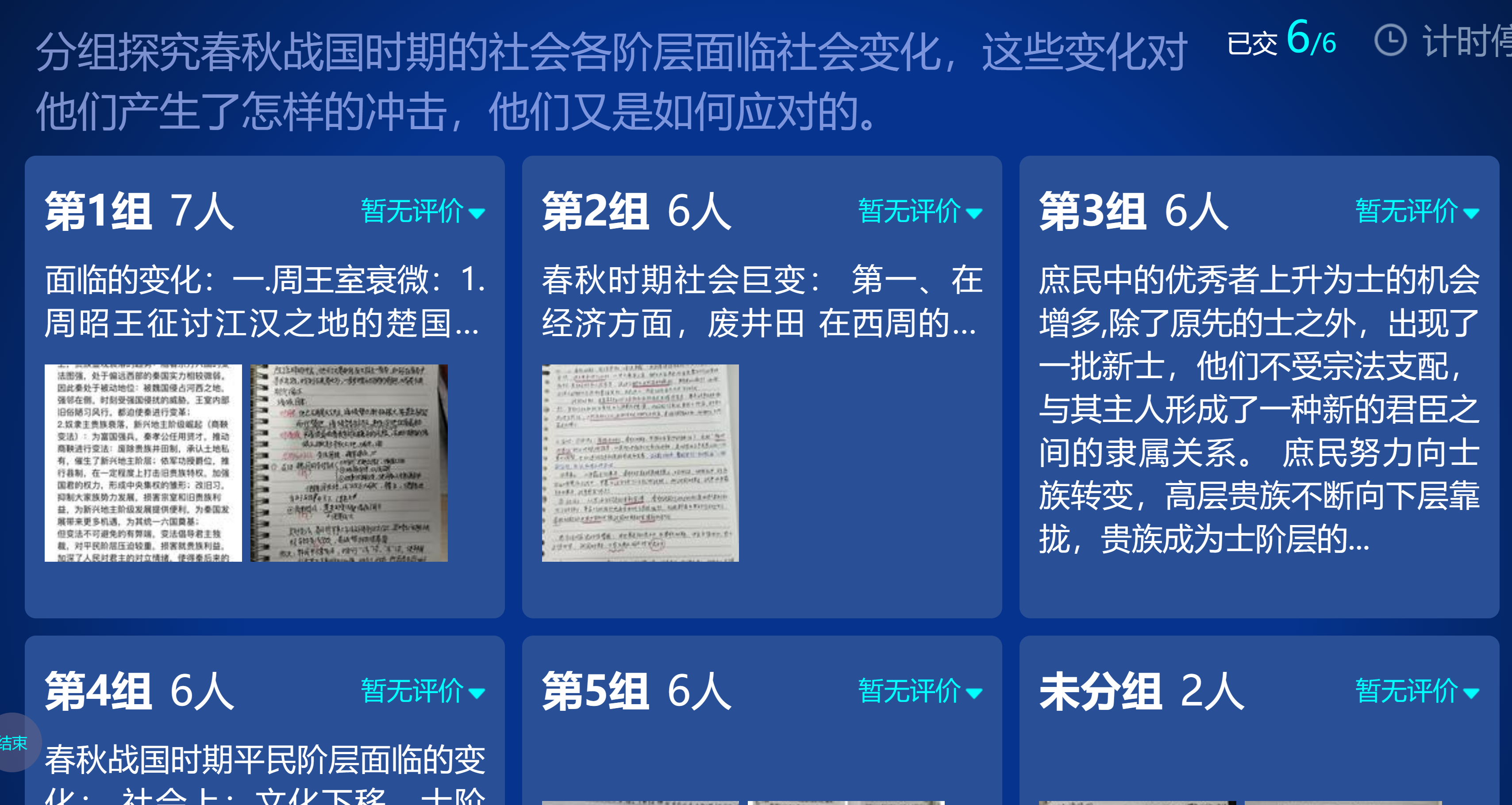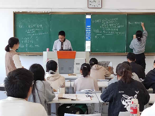 在课前,已通过学习通布置分组任务:探究春秋战国时期的社会各阶层面临的社会变化,这些变化对他们产生了怎样的冲击,他们又是如何应对的?课上,薛立芳指导各小组进一步总结本组观点,并由各小组推选代表汇报本组研习成果,采用一人汇报、一人板书要点的方式,分别讲述了诸侯国君、卿大夫、士、平民阶层在春秋战国时期面临的社会变革与所遭遇的冲击等知识点;并从正反两面寻找例证说明各个阶层不同的应对之方,最后从中总结历史的经验与教训。